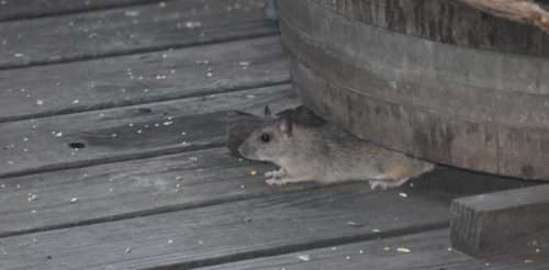 As welcome as the smoke, a roof rat this evening crawled out from under a planter barrel on our deck to poach birdseed.