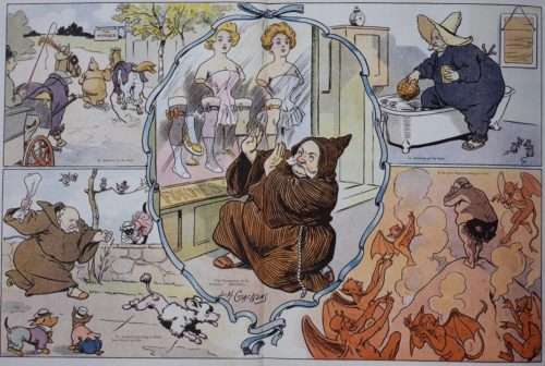 “At the upper left, Comstock leads clothed horses down a park path, and below that he attempts to serve a warrant on ‘a shameless French poodle.’ On the right… we see Comstock bathing fully clothed and, finally, in the last scene he ‘gets what is coming to him,’ tormented by winged devils in the fiery abyss of hell — in which he wears only a peek-a-boo carnival mask across his ample posterior.”