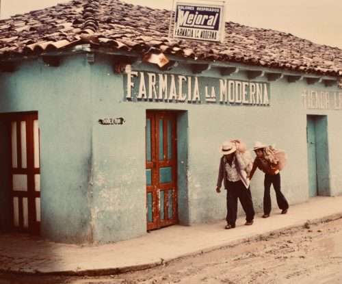 Another ironic sign: The “Modern Pharmacy” in rural Guatemala, 1982.