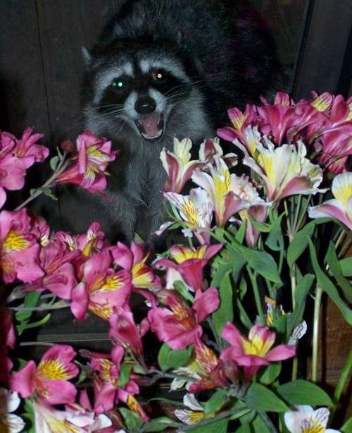 And a hearty “Happy Valentine’s Day!†from the raccoon I’ve trained to work as a flower vendor and who, I might add, would be only too happy to provide the bouquet for your celebration.