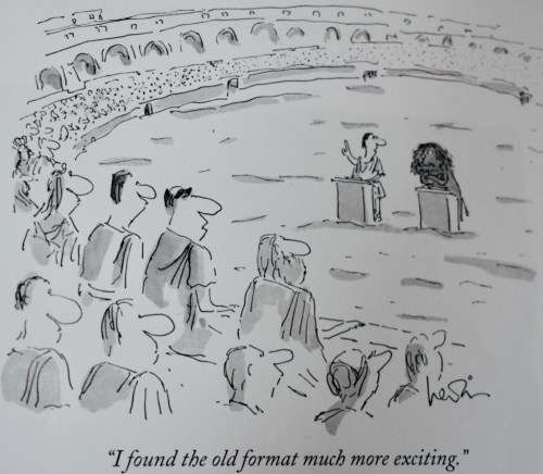 Formal debate had already begun replacing aggressive prosecution in another 1982 New Yorker cartoon. I had considered the gladiators-versus-lions in the Roman Coliseum the ultimate high-stakes event. It never occurred to me a lion might have to to impeach a histrionic gladiator who had overindulged his sense of entitlement.