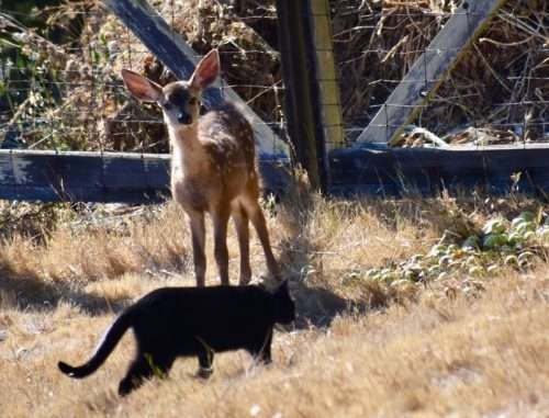 Here are some thoughts about the world and a few portraits of some local critters. This cute couple is a stray cat, Newy, we’ve adopted, and a curious blacktail fawn. (Photo by Lynn Axelrod Mitchell)