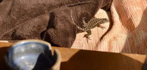 Here’s a blue belly lizard she dropped off on the living room couch.