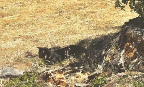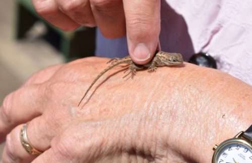 Lizards, like the sparrow, often are in a dazed shock after spending time in the cat’s jaws, and this makes it possible to catch and pick them up as Lynn is doing here.