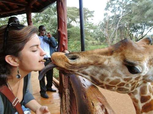 An adventurous young lady, Shaili has traveled widely. Here she feeds a giraffe mouth to mouth in Kenya. Shaili said the creature was as friendly as it looks.