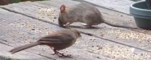The birds such as this towhee act as if the roof rats were just other birds and are quite content to eat alongside them.