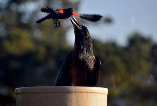 A male red-winged blackbird repeatedly buzzes a raven drinking from our birdbath and eventually drives him away. Since ravens sometimes eat baby birds, the blackbirds don’t like ’em.