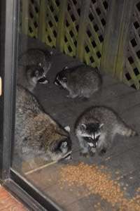 A mother raccoon, who shows up outside our kitchen door every evening begging for kibble, brought four new kits with her the past two nights. They’re very cute and often climb the lattice to the railing but then have trouble climbing back down. They do it headfirst, so it’s a challenge.