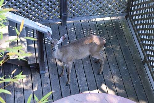 Even more of a surprise was this blacktail doe who showed up on our lower deck two mornings ago and then went down some stairs to a still-lower level to inspect our hot tub. My wife Lynn already suspected that a deer had been venturing onto the lower deck at night because some buds in a flowerpot there were getting eaten. I was skeptical, but I guess she’s right.