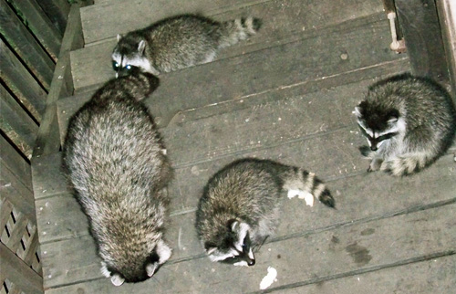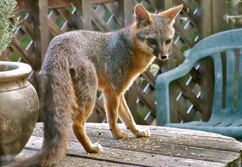 A flock of tri-colored blackbirds swoop down onto the deck railing when Lynn or I spread a line of birdseed along it morning and evening. Many of the blackbirds nest in reeds at the pond.