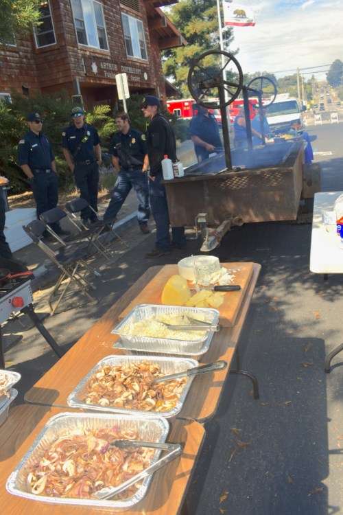 Several county fire department personnel, including Battalion Chief Bret McTigue, standing behind the Hog Island Oyster grill were on hand. The barbecues were set up in front of the public safety building, which houses the Point Reyes Station firehouse and the sheriff’s substation.