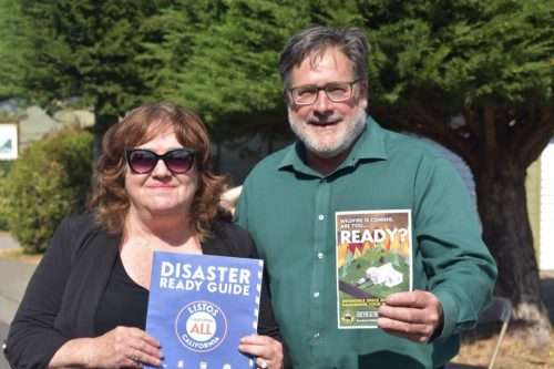 Cindy Morris of Point Reyes Station and Supervisor Dennis Rodoni hold up some disaster readiness information. More is available at pointreyesdisastercouncil.org.